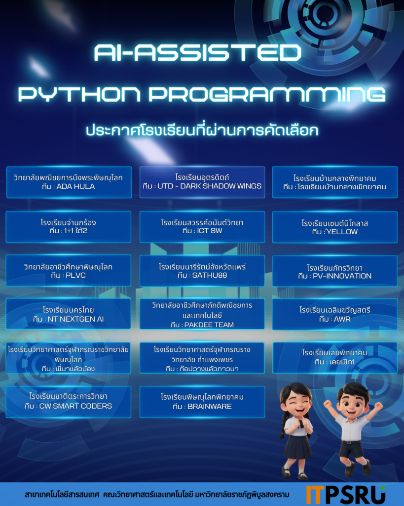 สาขาวิชาเทคโนโลยีสารสนเทศ มรพส. ขอเชิญชวนนักเรียนระดับมัธยมศึกษาตอนปลาย และนักศึกษาระดับประกาศนียบัตรวิชาชีพ (ปวช.) ที่มีความสนใจด้านการเขียนโปรแกรมและเทคโนโลยีปัญญาประดิษฐ์ เข้าร่วมการแข่งขัน “AI-Assisted Python Programming” ประจำปี 2569 เพื่อเปิดโอกาสให้เยาวชนได้พัฒนาทักษะการเขียนโปรแกรมด้วย Python ร่วมกับเครื่องมือ AI สมัยใหม่ เรียนรู้กระบวนการคิดเชิงคำนวณ พัฒนาศักยภาพอย่างสร้างสรรค์ และสัมผัสประสบการณ์แข่งขันในระดับมหาวิทยาลัย